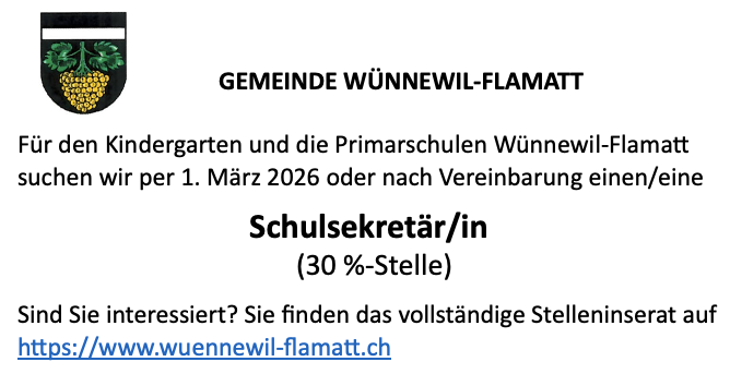 Sekretär/in gesucht 13. November 2025 Direkter Link: https://www.wuennewil-flamatt.ch/aktuellesinformationen/2638963